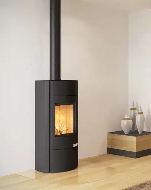 Puissance nominale de 7 kW, compatible avec des bûches jusqu’à 33 cm, pour chauffer des espaces jusqu’à 90 m². Format vertical compact, revêtement en fonte...